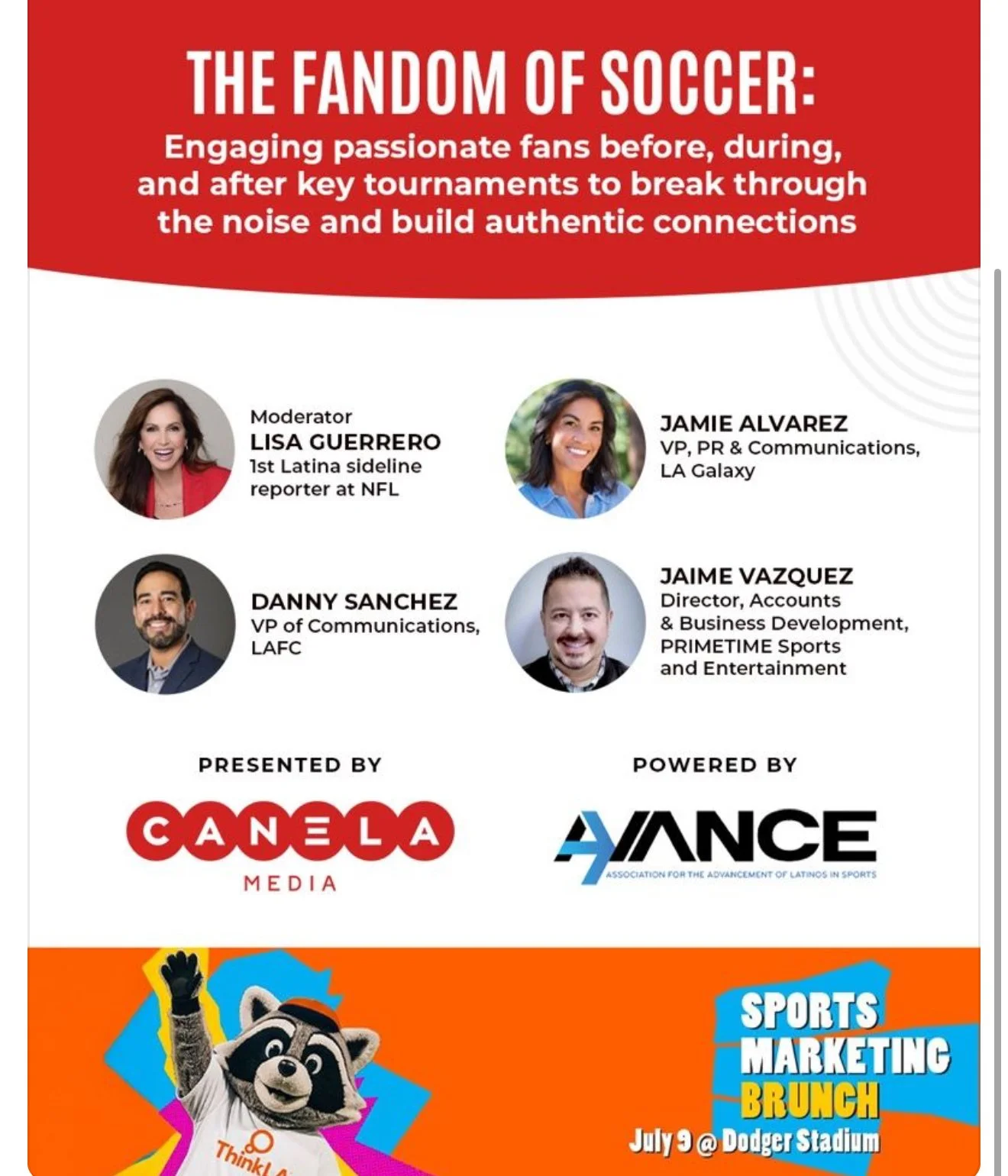 Thanks to Think LA for inviting me to moderate the “Fandom of Soccer” panel for their Sports Marketing Brunch at Dodgers Stadium on Wednesday July 9th. Speakers Jamie Alvarez (LA Galaxy) Danny Sanchez (LAFC) Jamie Vasquez (Primetime Sports) and I discussed the growing power and loyalty of LATINO SPORTS FANS.